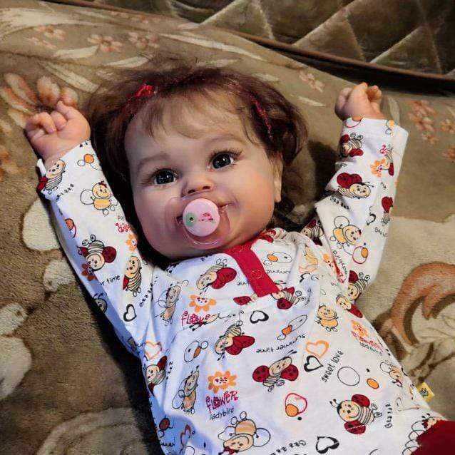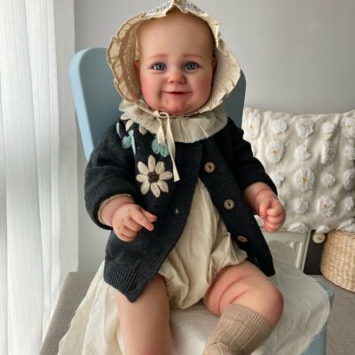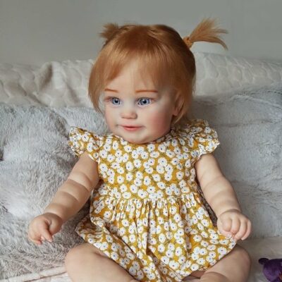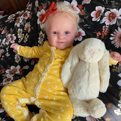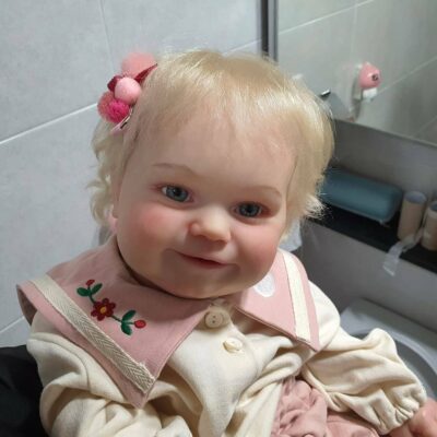 Her dreamy face feature with inset eyes, hand-painted eyebrows, irresistible rolls and a glossy mauve mouth to plant thousands of kisses on and blushing added to provide a lifelike appearance, like a reborn toddler. Her flawless soft skin and sweet disposition make her irresistibly cute, her hands and feet feature light blushing detail with expertly hand-painted finger and toenails. Plus her hand and legs are movable, so he can snuggle right into your arms. Her head, arms, and legs are crafted in amazing GentleTouch vinyl, and her weighted cloth body feels like a royal dream come true in your arms.