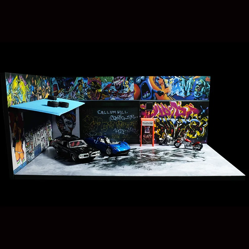 1/64 Scale Garage Parking Lot Factory Warehouse Graffiti Automobile Refitting Scene Fit Car Model Toy Gift Collection Display