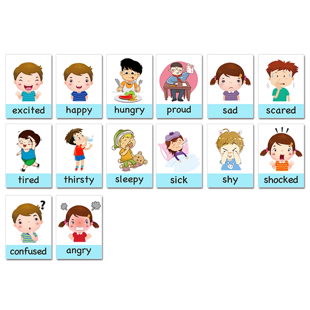 14pcs Montessori Baby Emotion Learning Card Cartoon English Emotion Flash Cards for Child Funny Memory Exercise Game