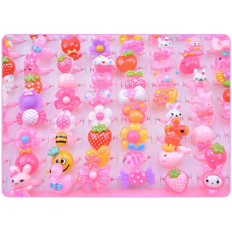 3/6/10pcs Kids Girl Cartoon Makeup Rings Fruit Flower Animal Diamond Shape Ring Finger Jewelry Rings Pretend Play Princess Toys