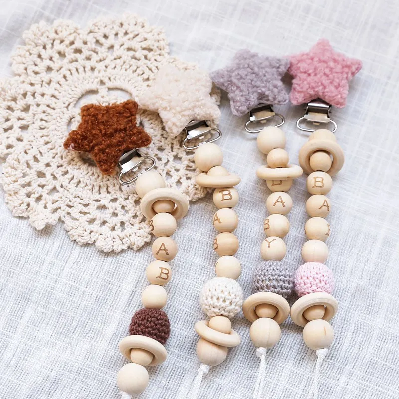 Baby Lamb wool Star Pacifier Chains Dummy Wooden Clips Chain Heart Baby Pacifier Clips Holder Chain Personalized Kids Toys