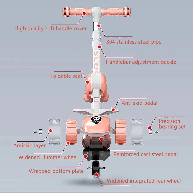 Children’s Scooter 3 Wheel Widened Wheel Music Folding Adjustable Height 3-12-year-old One Legged Scooter Kids Sports Toy Gifts