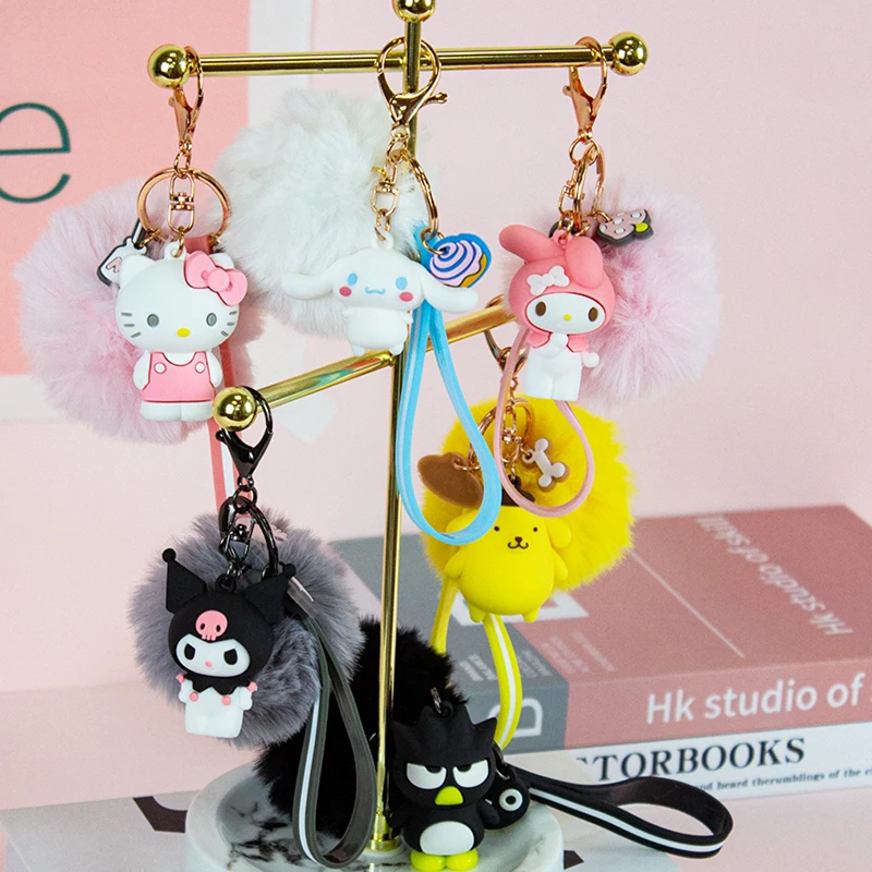 Hello Kitty Cute Sanrio Kuromi Penguin Frog Dog Cat Keychains with Fluffy Rabbit Fur Ball Women Girl Bag Pendant Keyring Gifts