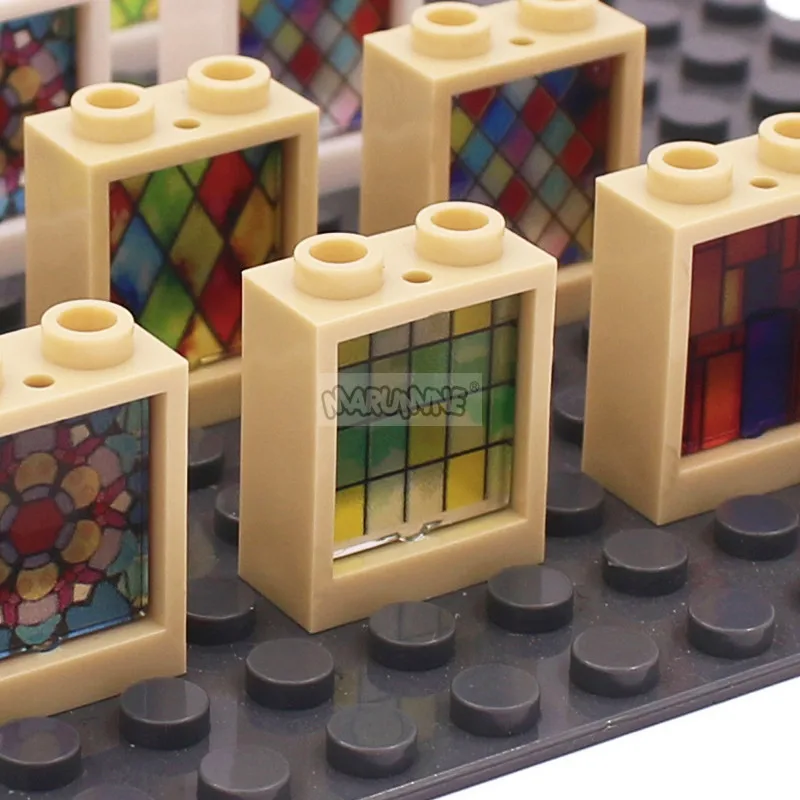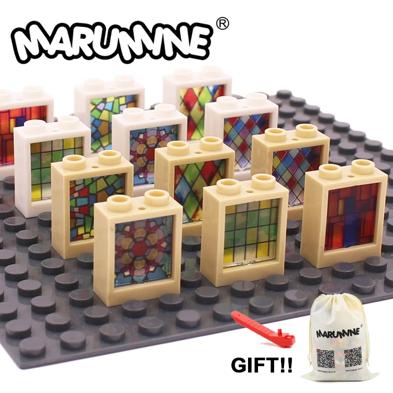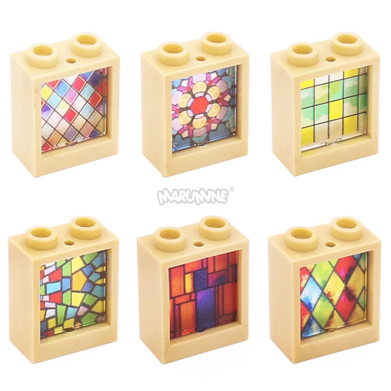 Marumine Block Glass Window 1x2x2 With Printing 18PCS 60601 60592 Church Assemblage Buildi Brick Construction Model Accessories