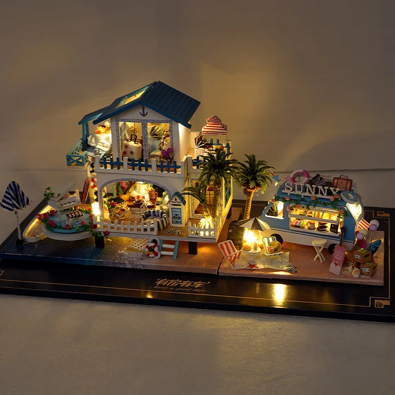 Mini Size Casa DIY Wooden Doll House Kit Miniature with Furniture Blue Ocean Cottage Dollhouse Toys for Friends Girls Xmas Gifts