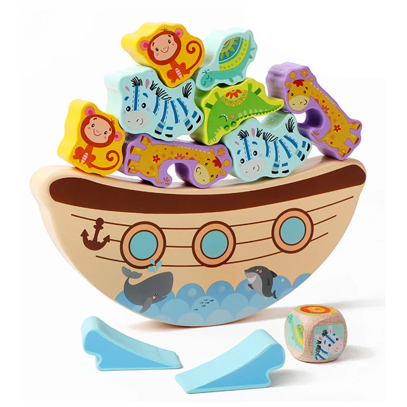 Montessori Animal Stack Balance Game Wooden Marine Life Throwing Dice Stacking Building Blocks Balance Training Educational Toys