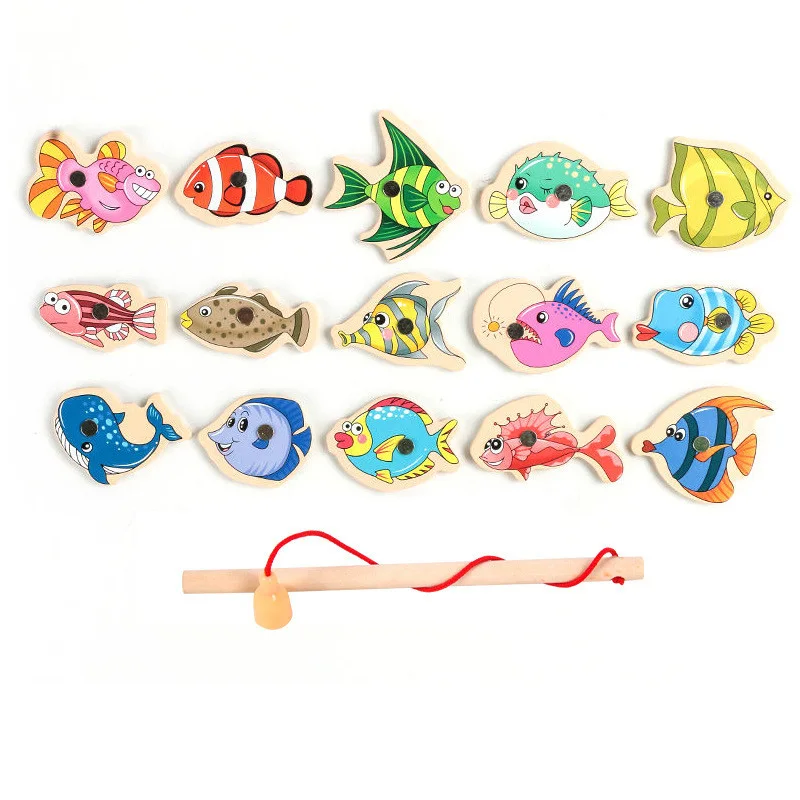 Montessori Wooden Magnetic Fishing Toys For Children Cartoon Marine Life Cognition Fish Games Education Parent-Child Interactive