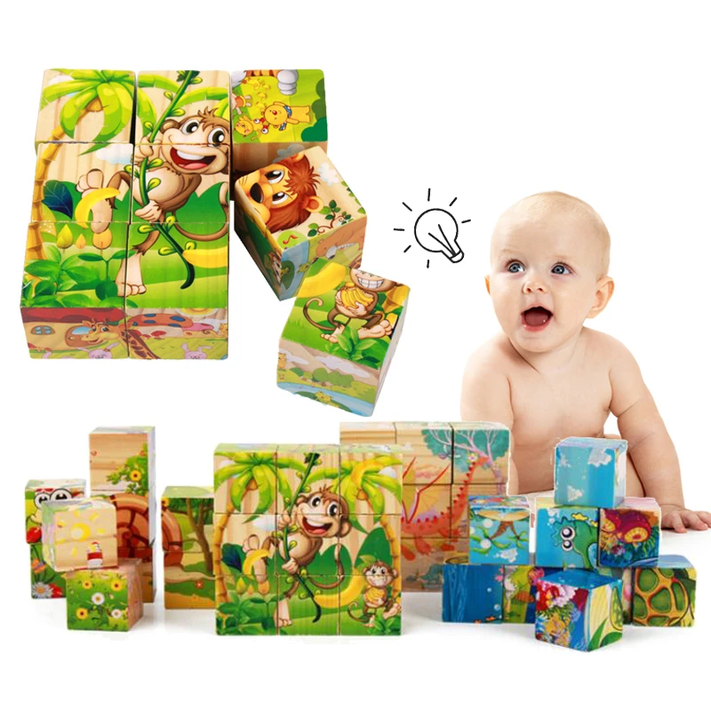Nine Blocks Six-sided 3D Jigsaw Cube Puzzle Wooden Toy For Children Wooden Cartoon Animal Puzzle Funny Games Kid Educational Toy