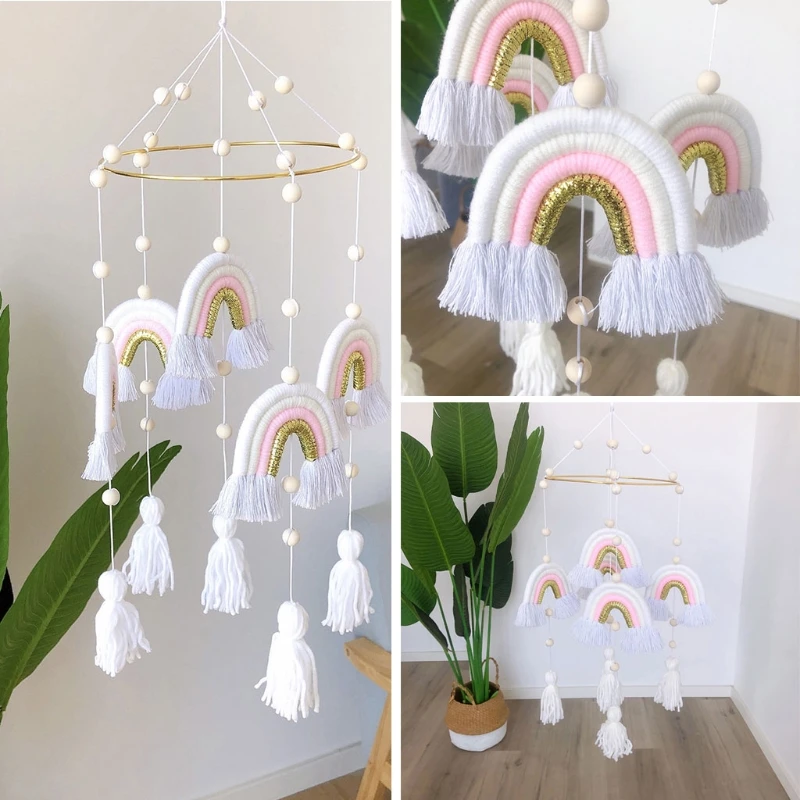 OOTDTY Nordic Style Handmade Weaving Rainbow Wall Hanging Decor Toys Baby Rattle Mobile Crib Toy Kids Room Decor Nursery Decor